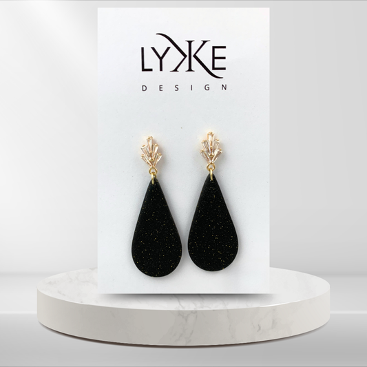 Gullfargede øredobber med stor sort dråpe med gullblad