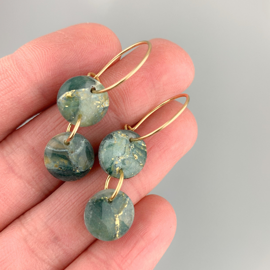 Kystgrønn - Gullfargede øreringer med to små sirkler, Grønn marmor/gull
