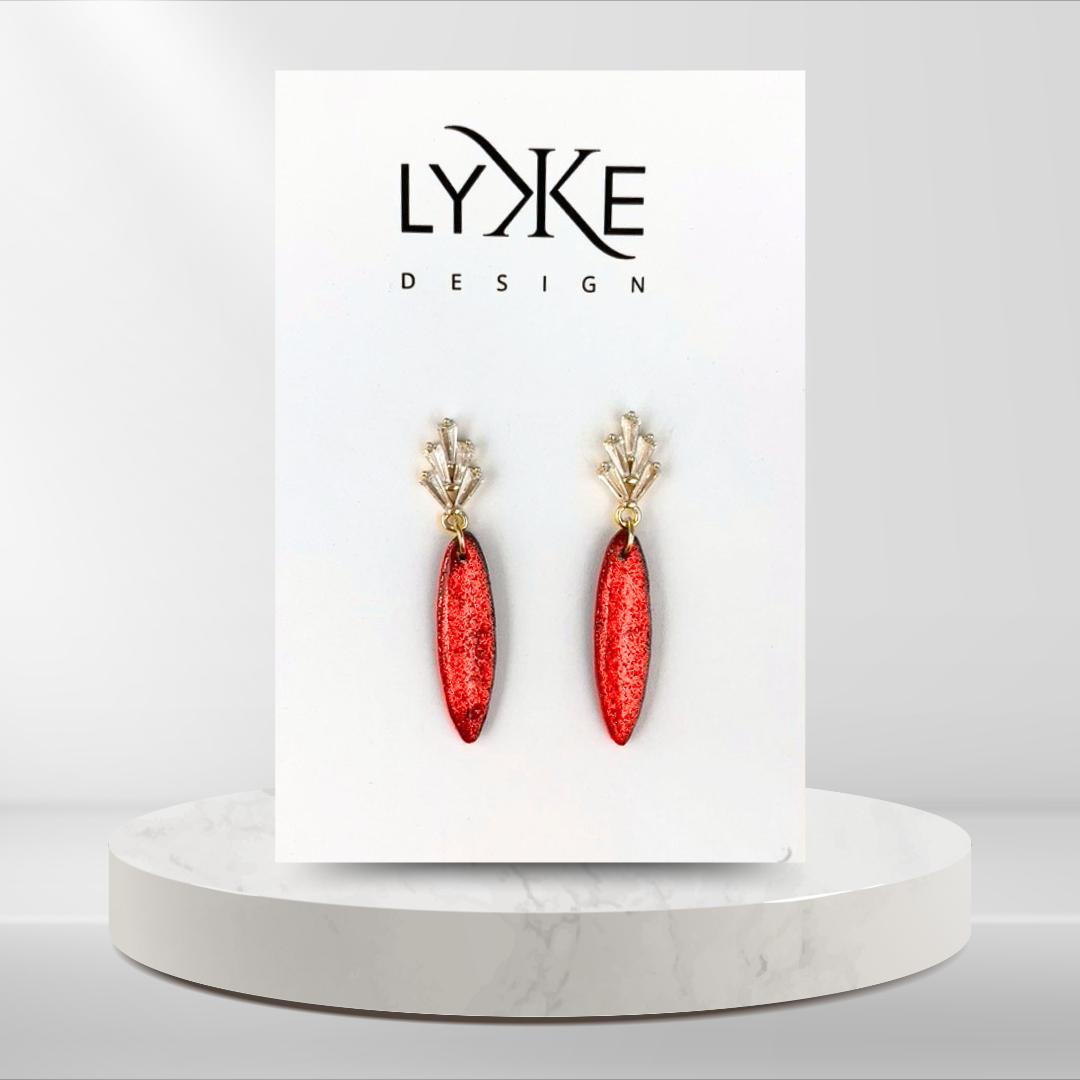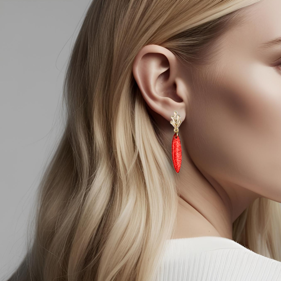 Nydelige øredobber med en lang rød dråpe med glitter-effekt og zirkonia stener, laget av polymerleire som er et lett materiale som ikke tynger på øret.