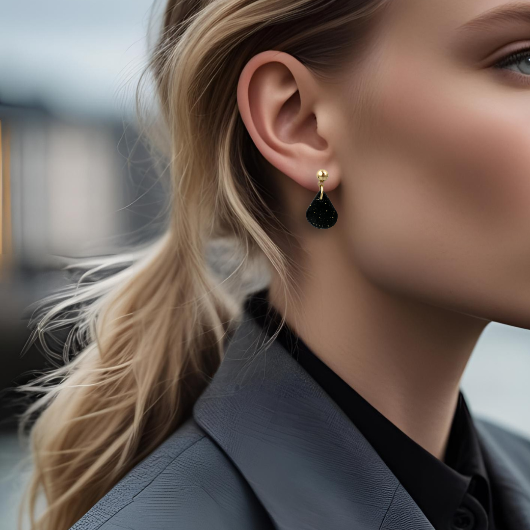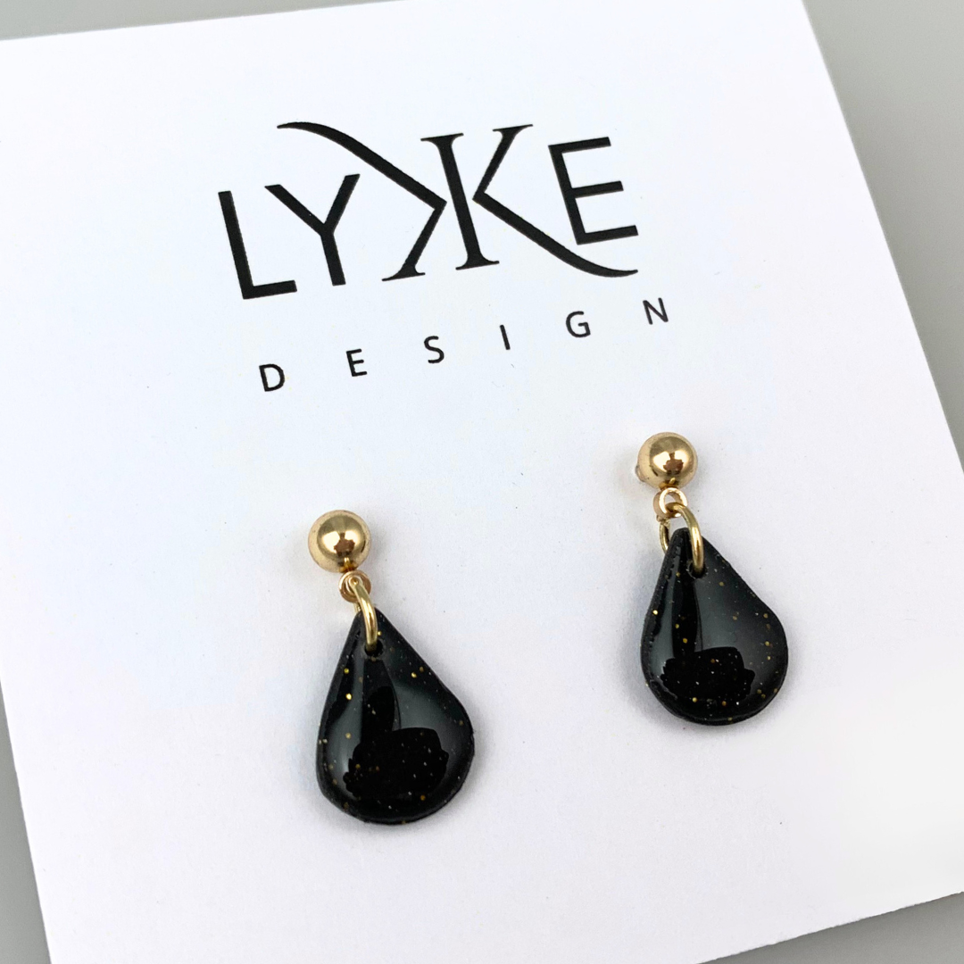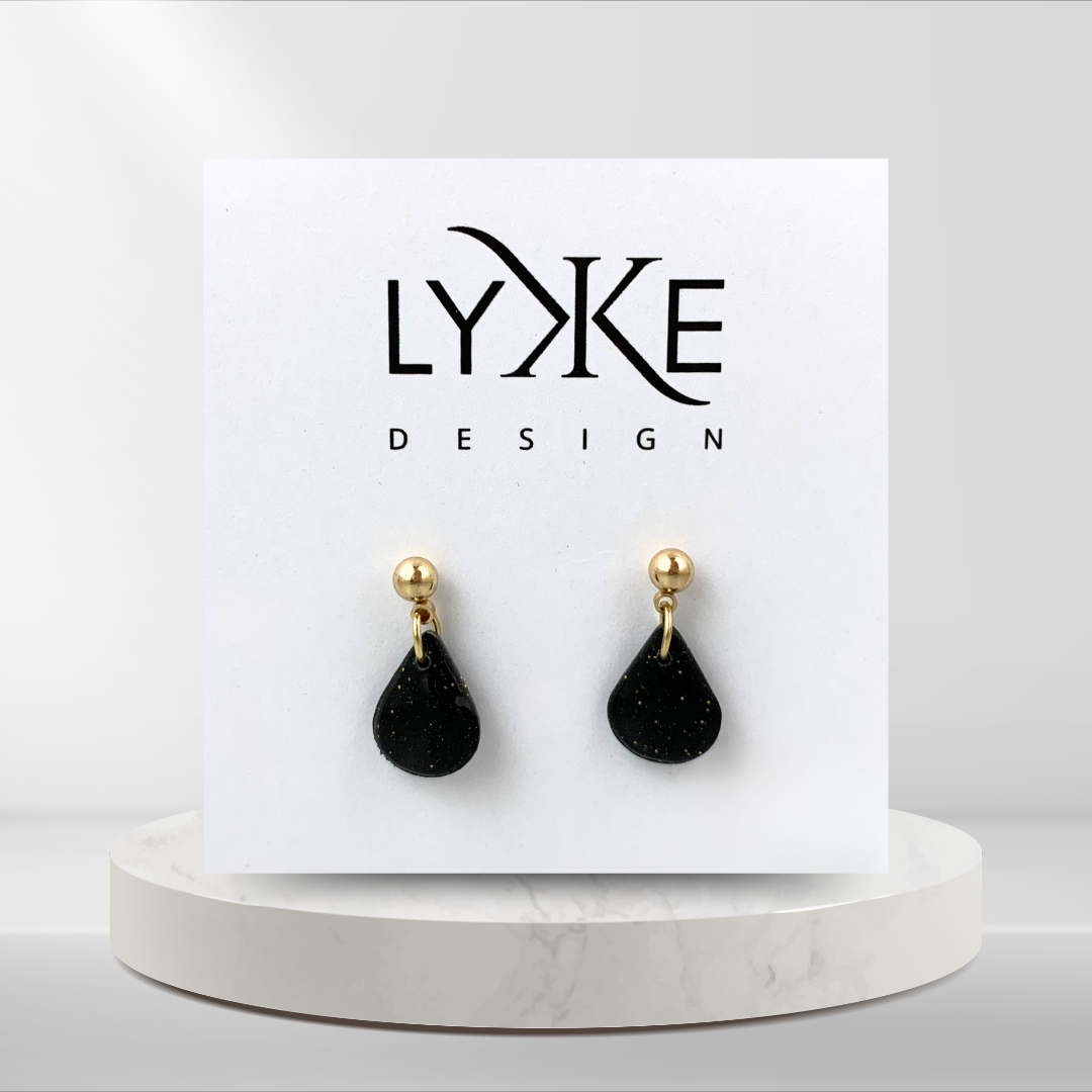 Nydelige øredobber med en liten sort dråpe med svak glitter effekt på gullkule-stikk, laget av polymerleire som er et lett materriale som ikke tynger på øret.