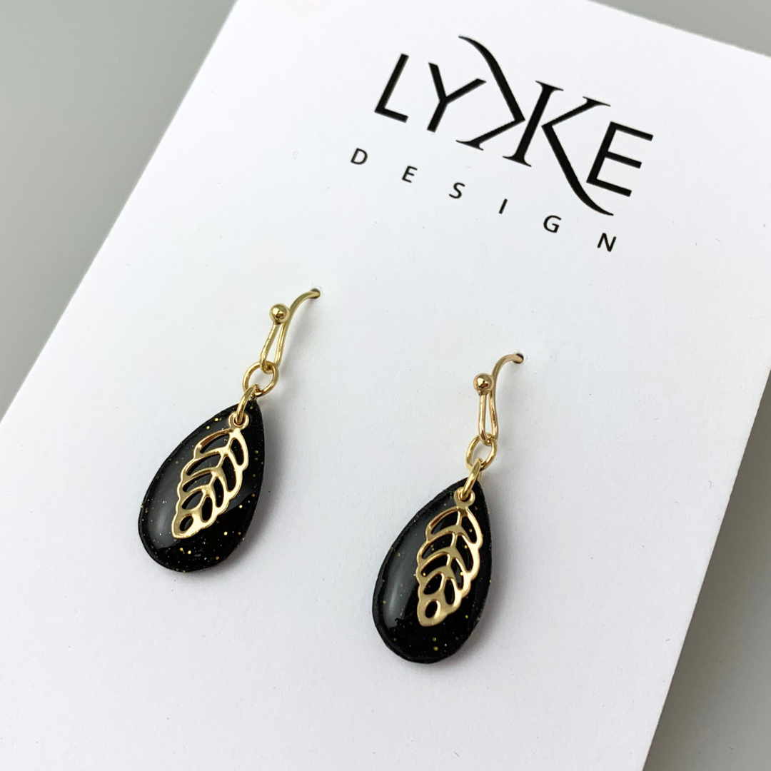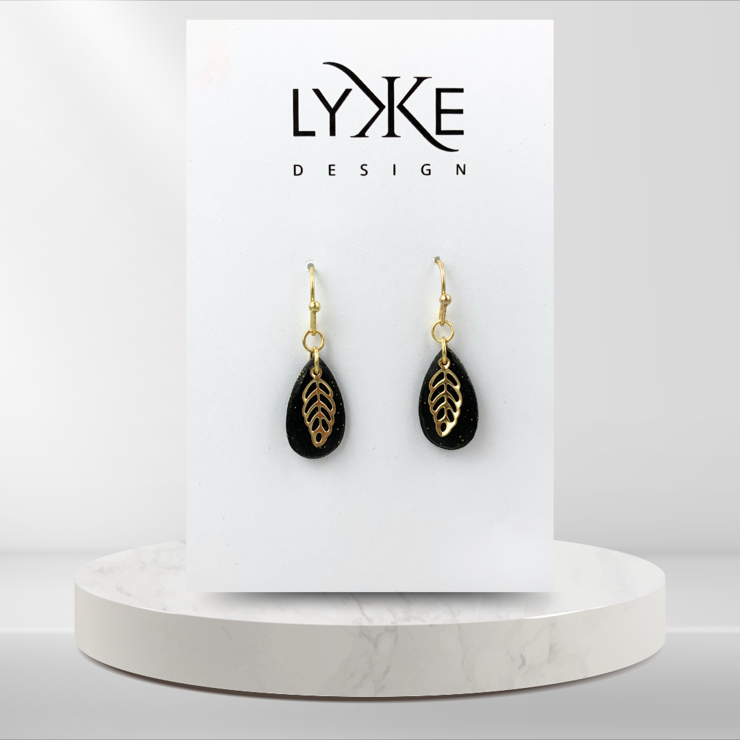 Gullfargede øredobber medium dråpe med gullblad Sort/gull