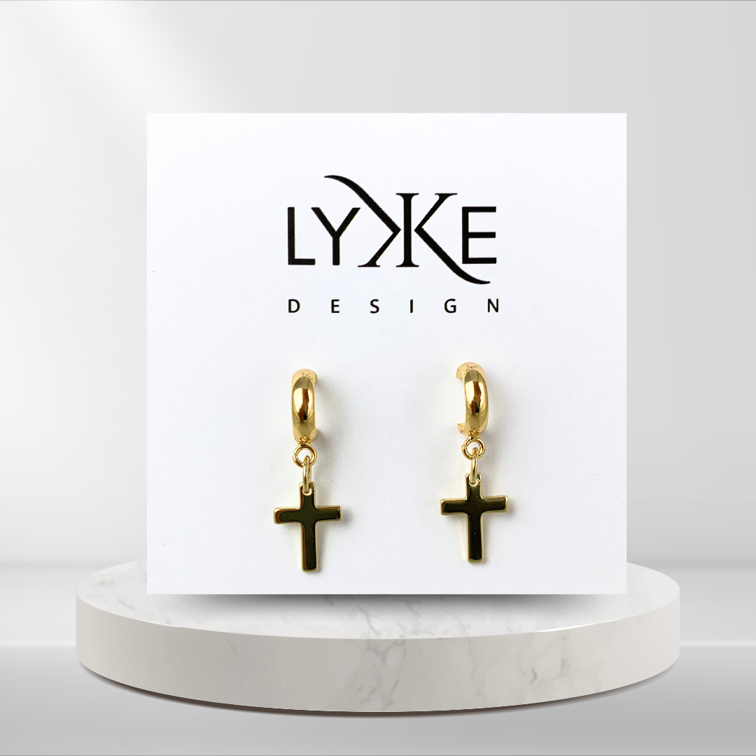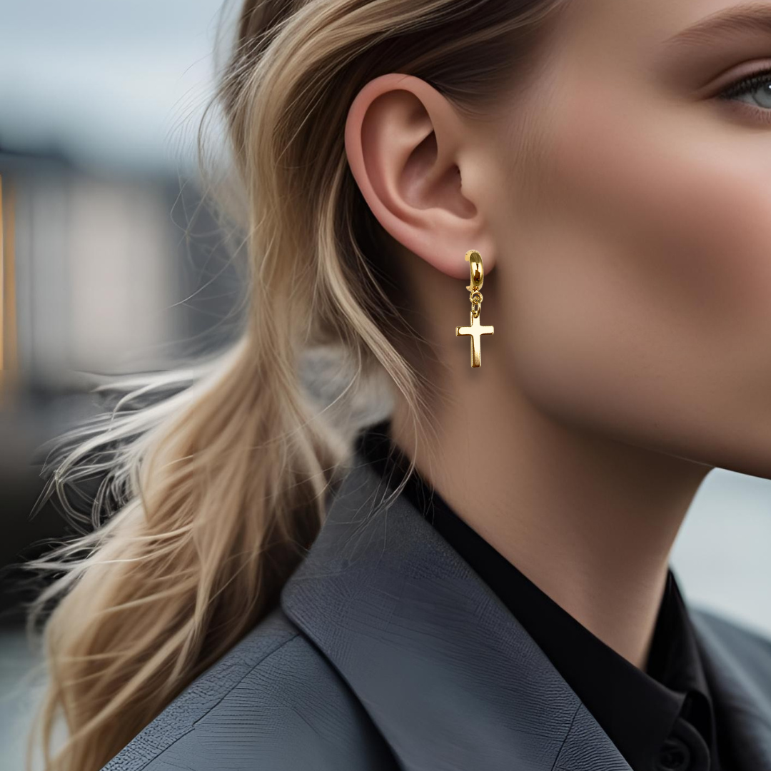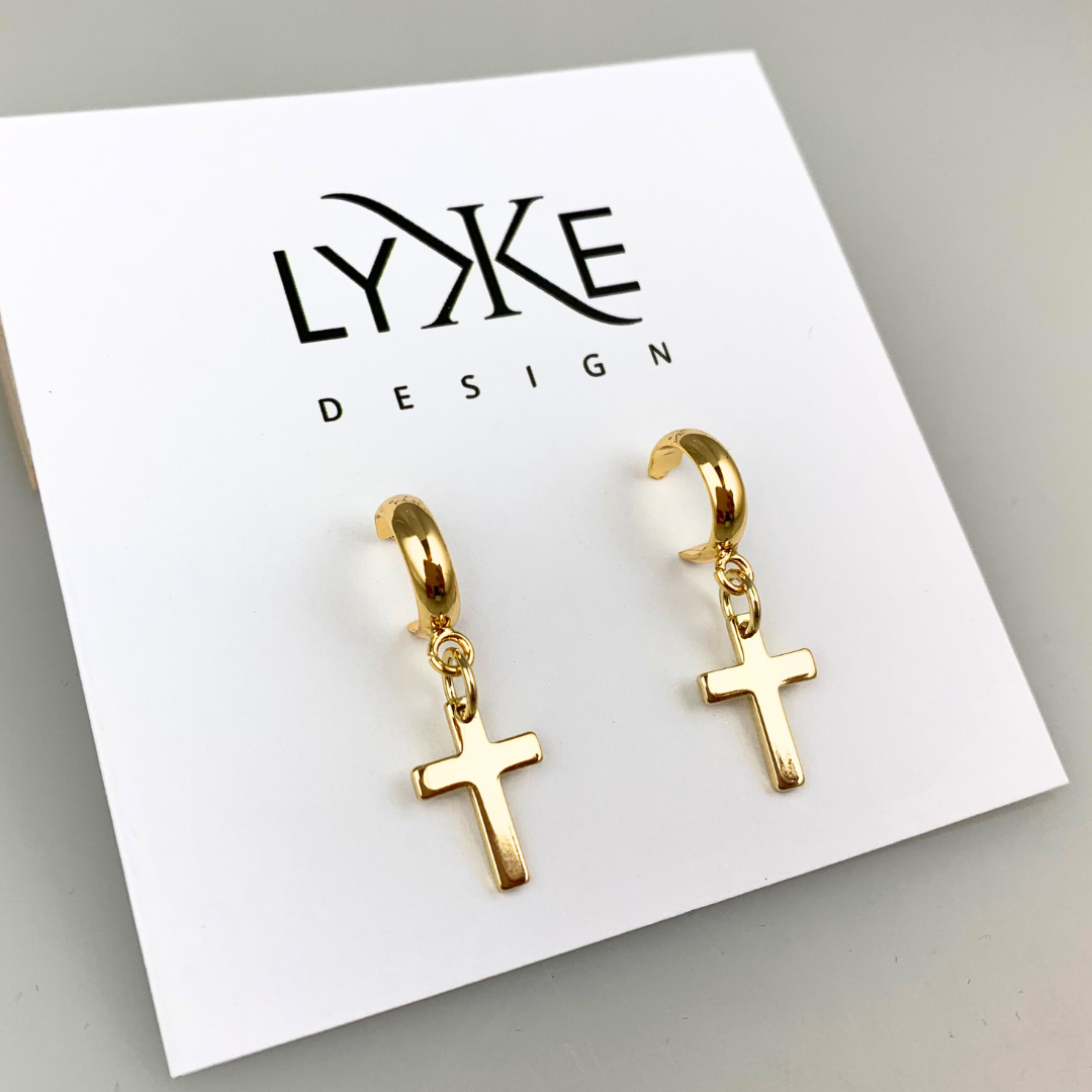Gullfargede øreringer med gullkors