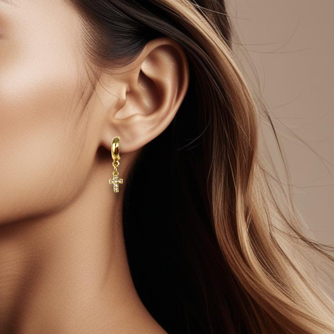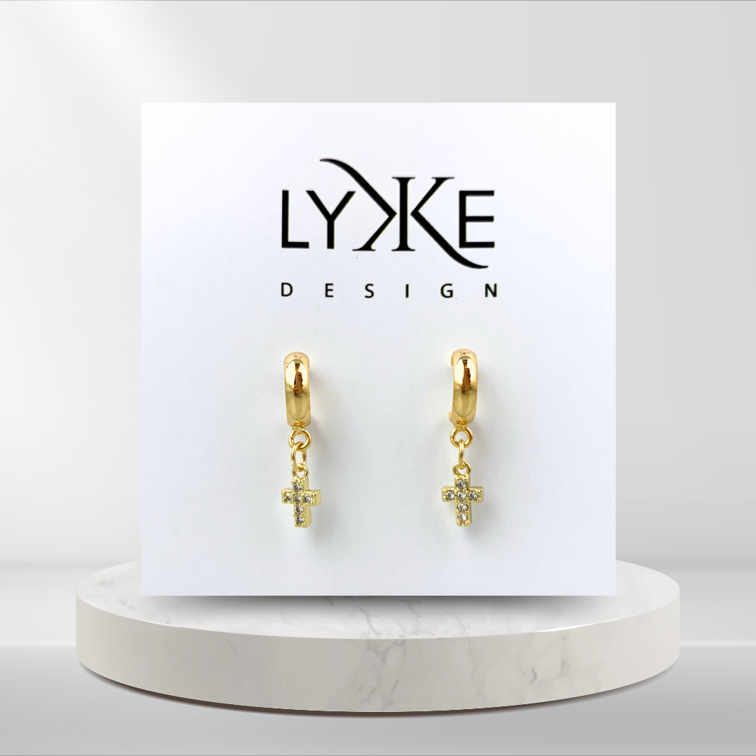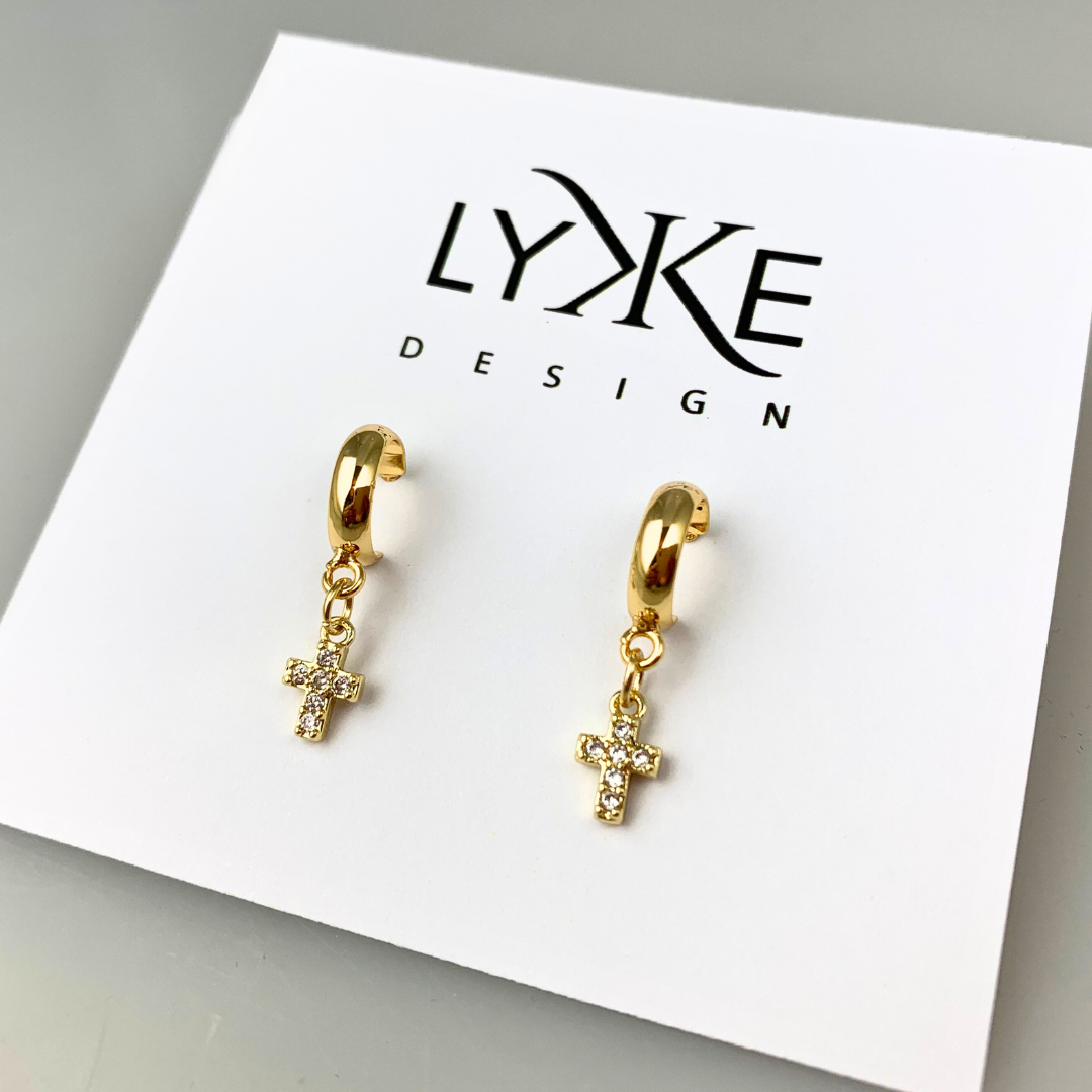 Vakre øreringer med en nydelig kors-charm med blanke zirkonia-stener. Lette og behagelige å ha på gjennom hele dagen.