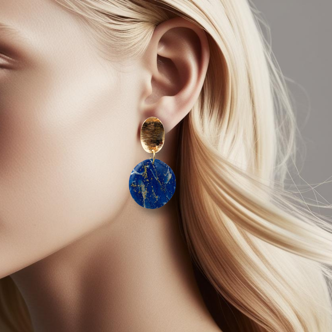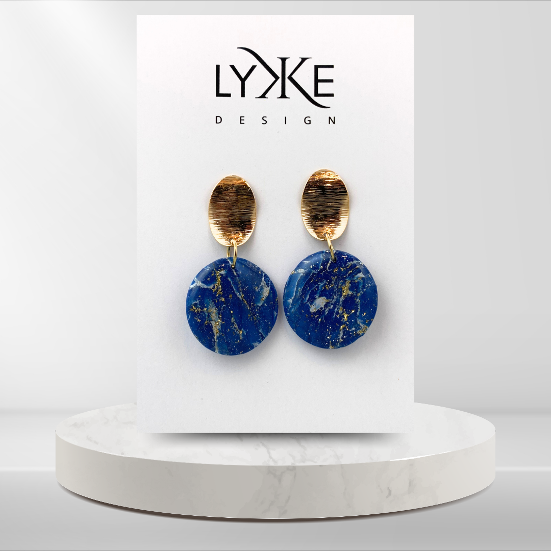 Havglimt - Gullfargede ovale øredobber med blå marmor-effekt