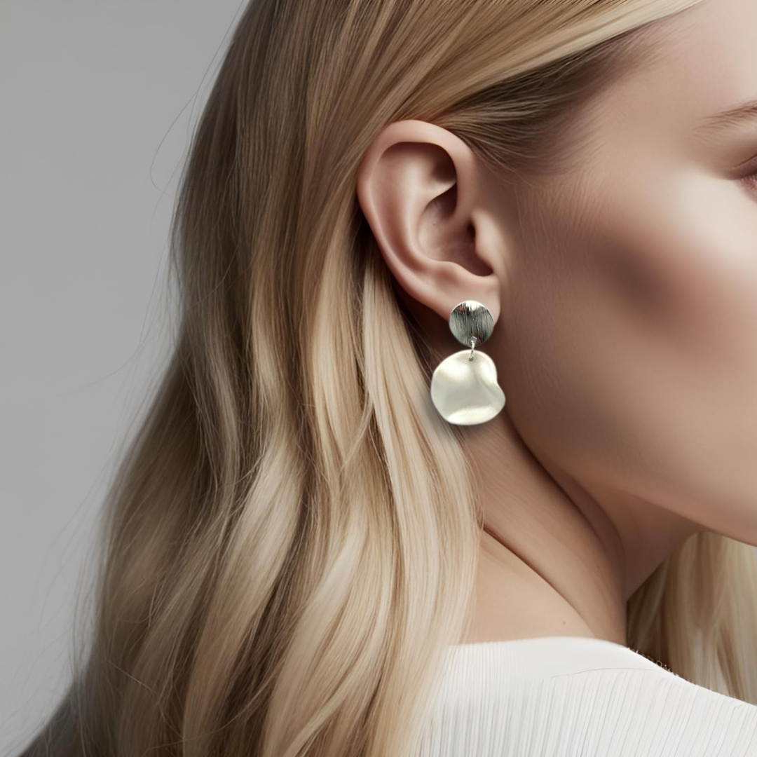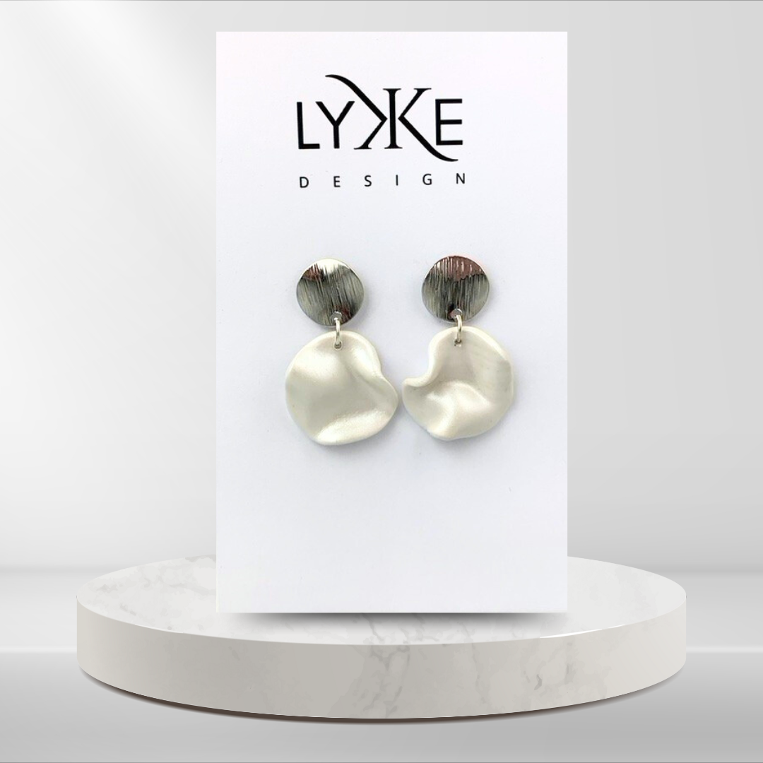 Trendy øredobber med bølget sirkel med shimmer-effekt, laget av polymerleire som er et lett materiale som ikke tynger på øret.