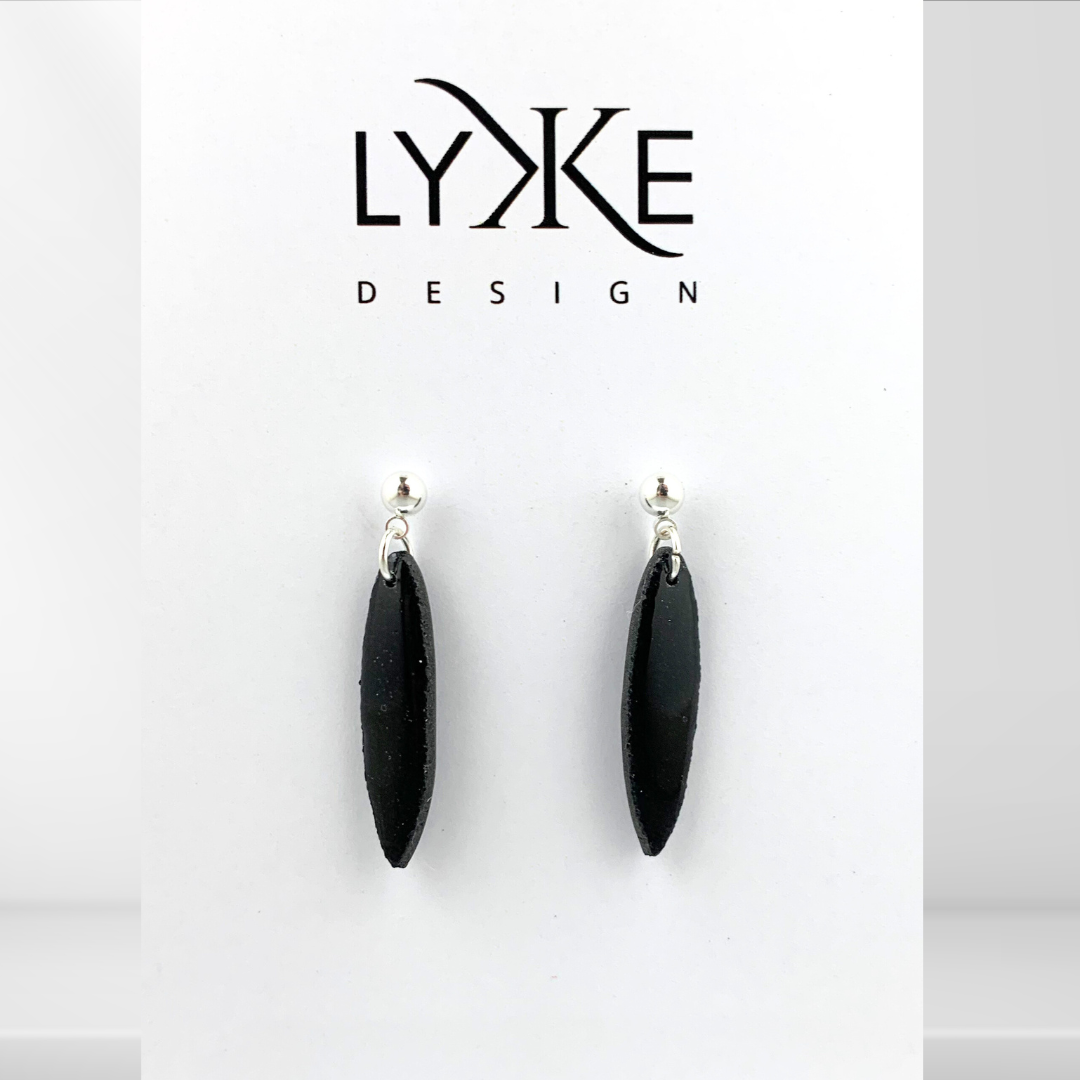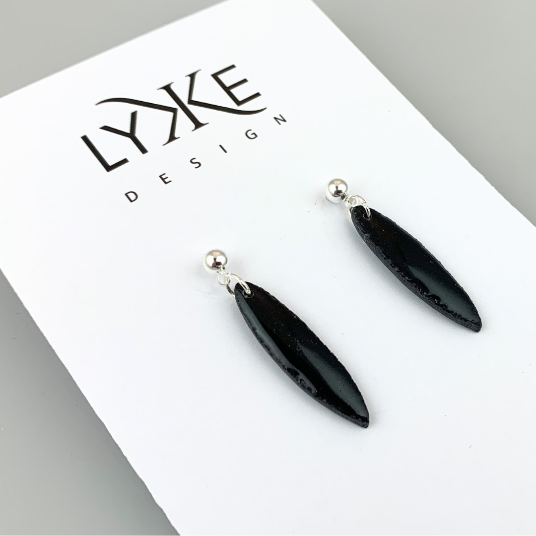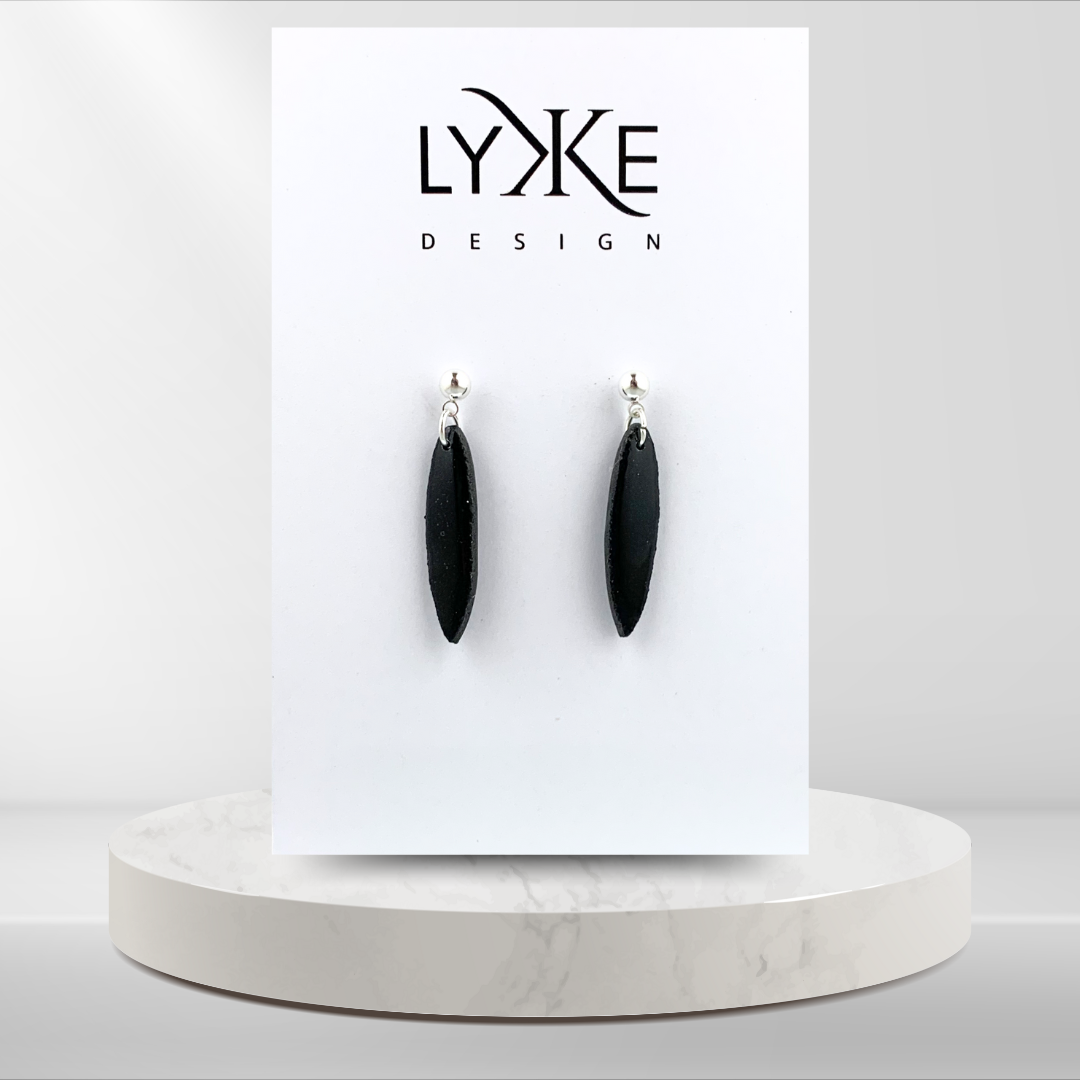 Øredobber med avlange dråper med sort glitter effekt på sølvkule-stikk, laget av polymerleire som er et lett materiale som ikke tynger på øret.