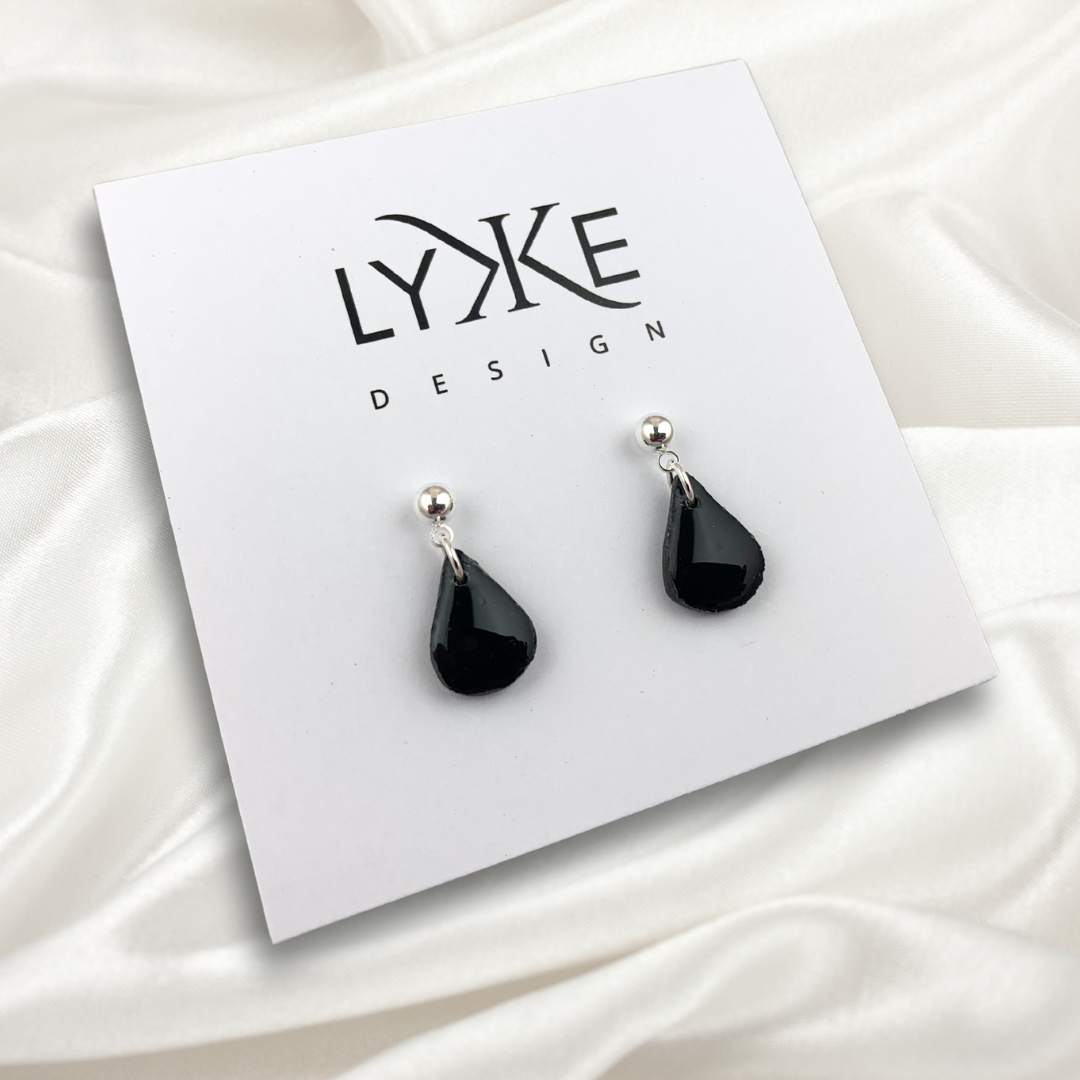 Nydelige øredobber med en liten dråpe på sølvkule-stikk, laget av polymerleire som er et lett materiale som ikke tynger på øret.