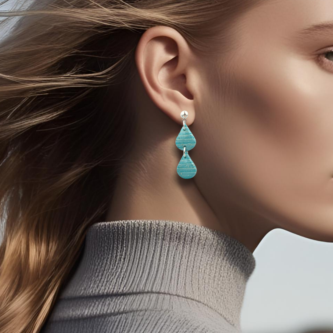 Disse vakre, håndlagde øredobbene med turkise striper er laget av polymerleire, et lett og holdbart materiale som sikrer at ørene dine ikke tynges, selv ved langvarig bruk.