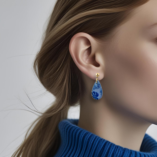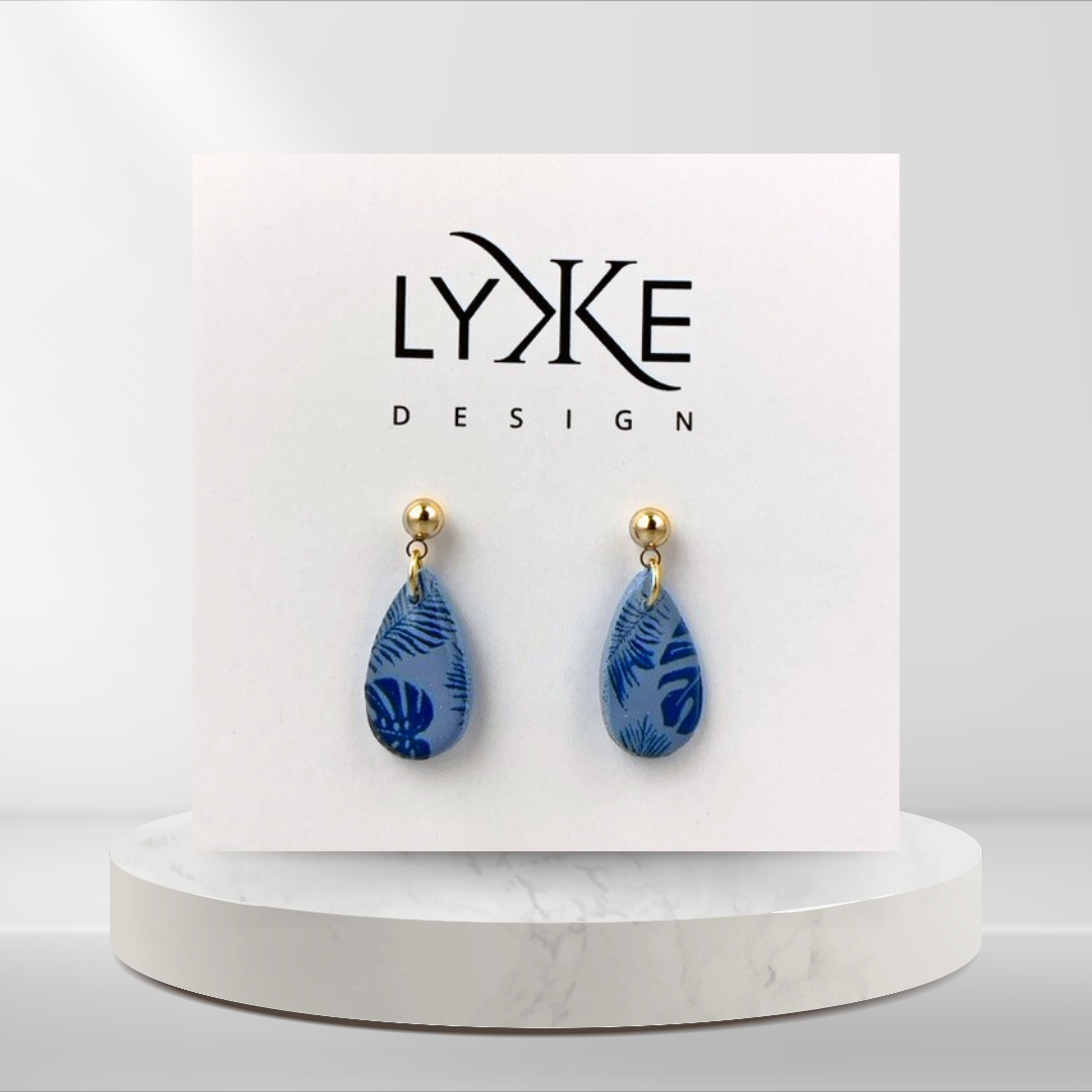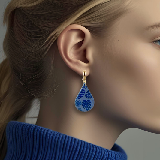 Gullfargede øreringer - blå dråpe med Monstera-trykk